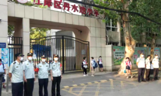 开学第一天早上7:30,8名区城管执法大队直属二中队的下沉党员已驻守在丹水池小学,大家分工行动,在学校门口维持秩序,协助疏导交通。