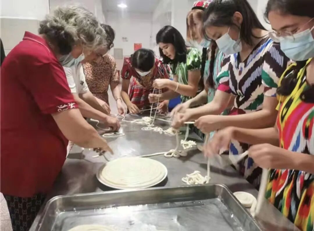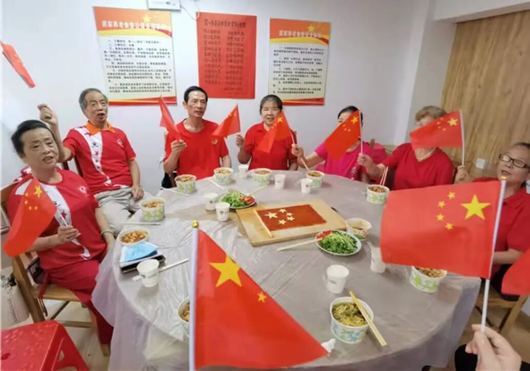 江岸区百步亭社区居民自发开展“家国情、邻里爱、国庆面”系列活动。社区全国文明家庭、志愿者和居民一道同做长寿面,同吃国庆面,倡导新民俗,云端晒祝福,展示社区老百姓的小康生活。