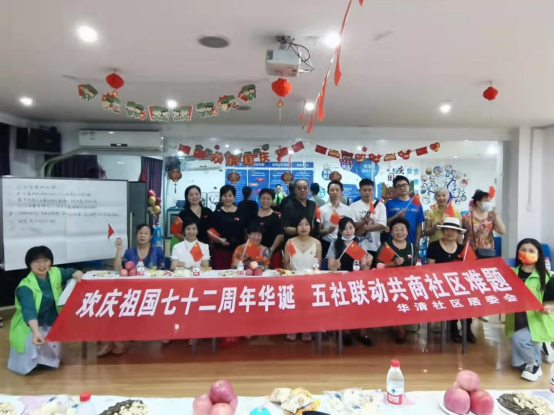 华清社区联合万帮社工组织辖区社区社会组织、社区志愿者、社区红色物业、快递小哥代表,共商共议社区难题,进一步发挥五社联动机制作用,助力基层治理,向新中国成立七十二周年献礼。