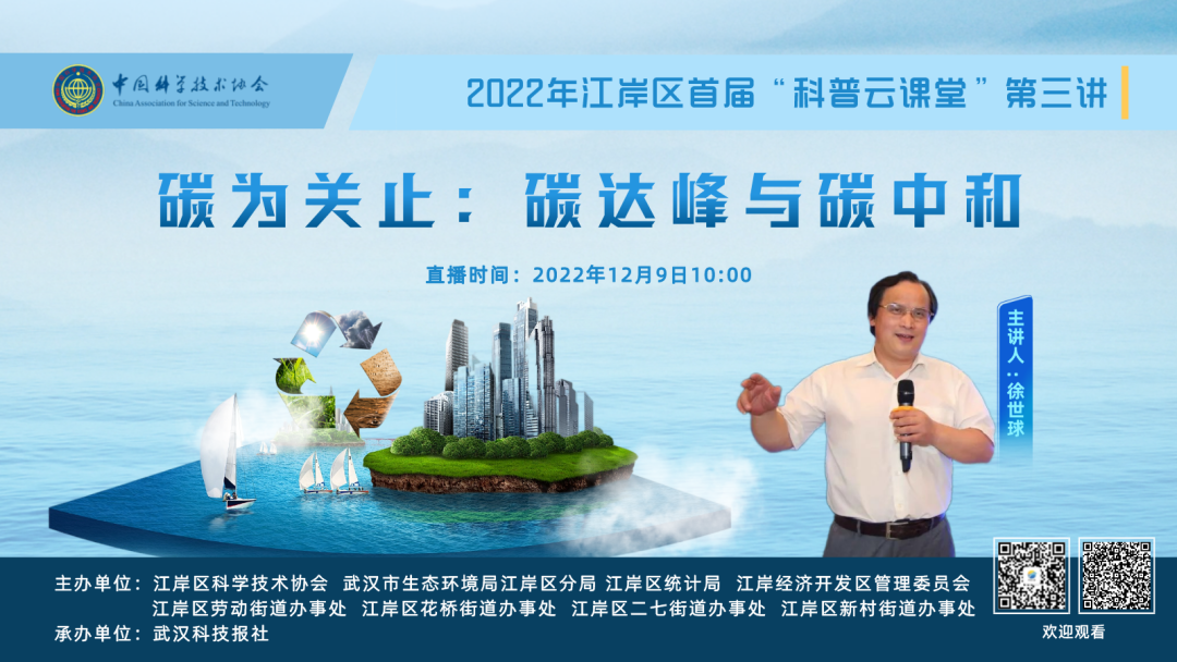党的二十大报告再次强调了“双碳目标”,做出了新的战略部署。我国将如何实现双碳目标?何为碳达峰、碳中和?如何通过减污降碳协同增效,通过提高能源资源效率,调整产业结构、优化能源结构,大幅度降低了碳排放?为做好双碳科普宣传,增长广大群众环保知识,特邀请中国地质大学教授徐世球,开展相关双碳知识主题讲座。