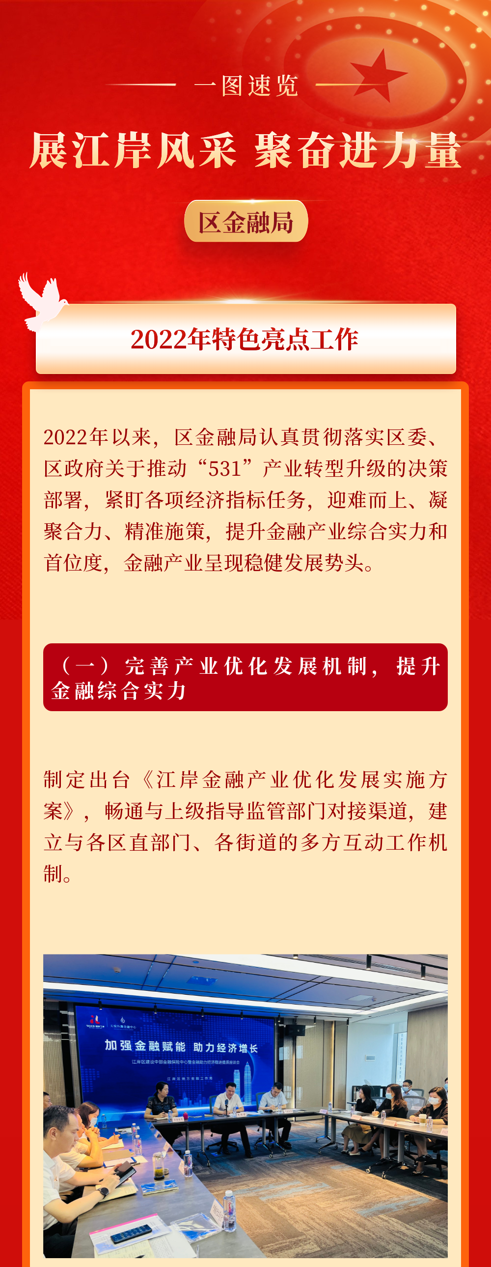 区金融局将在区委、区政府的坚强领导下,深入学习贯彻党的二十大精神,把学习成果转化为下一步具体行动和工作实效,着力提升金融产业支撑力,找准金融主导产业定位,找准金融服务产业、服务项目、服务企业定位,找准金融发展趋势定位,以推动高质量发展为主题,为建设美好江岸贡献金融力量。
