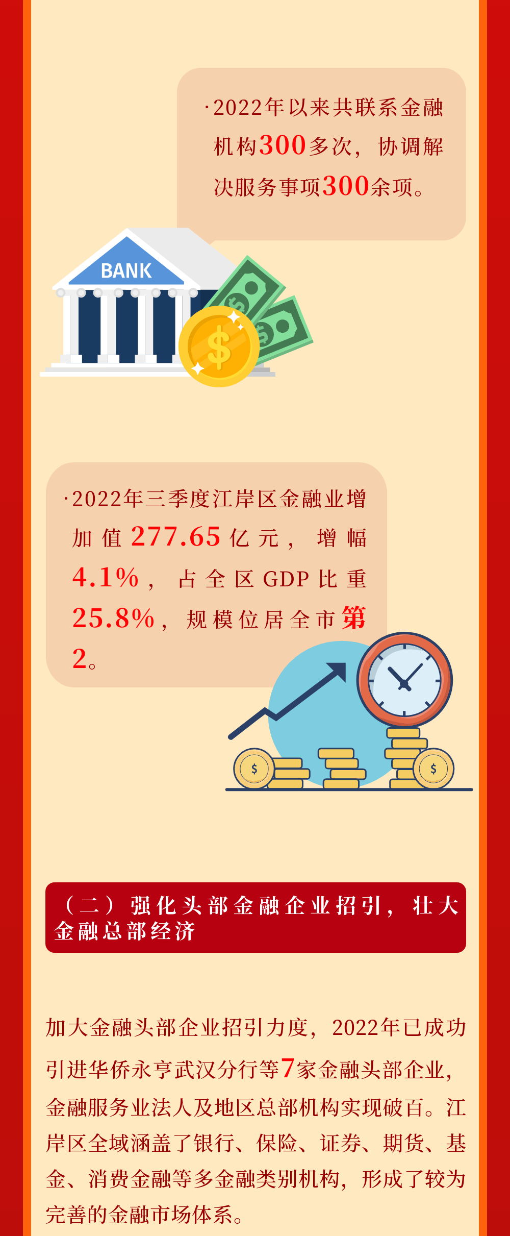 紧盯仍未在湖北设立分支机构的国内外金融机构及金融科技100强企业,争取更多外资银行、保险证券机构在江岸设立区域总部,积极引进金融科技、消费金融、汽车金融、私募投资基金,支持金融研发中心、结算中心等集约型金融后备服务中心落户,健全完善金融组织体系。