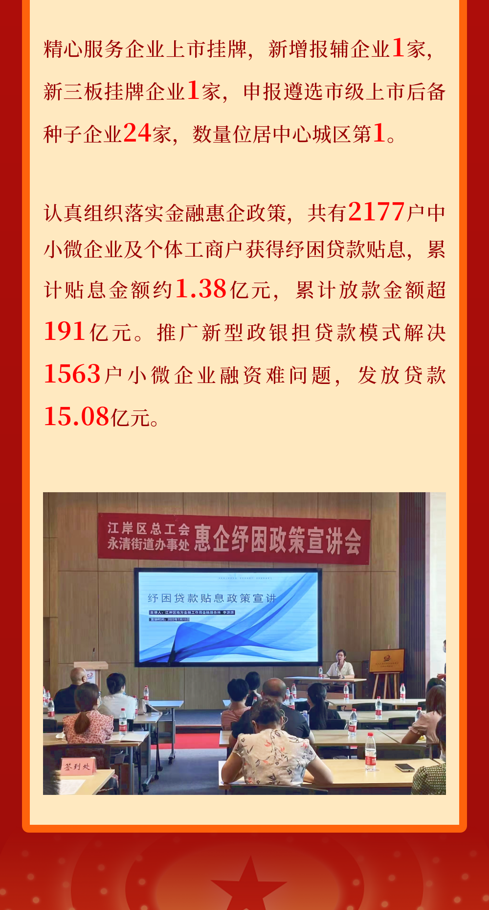 积极与金融监管部门及行业协会的沟通对接,加强与金融机构沟通交流,组织开展“小而精”的金融交流活动,支持金融机构加强绿色金融、科创金融、数字金融产品服务创新和场景发布应用。推动创投企业、创投管理企业和天使投资人登记注册便利化,建立优质股权投资机构企业和项目库,完善基金投资服务体系,开展金融创新产品服务发布活动,持续擦亮江岸金融特色品牌。