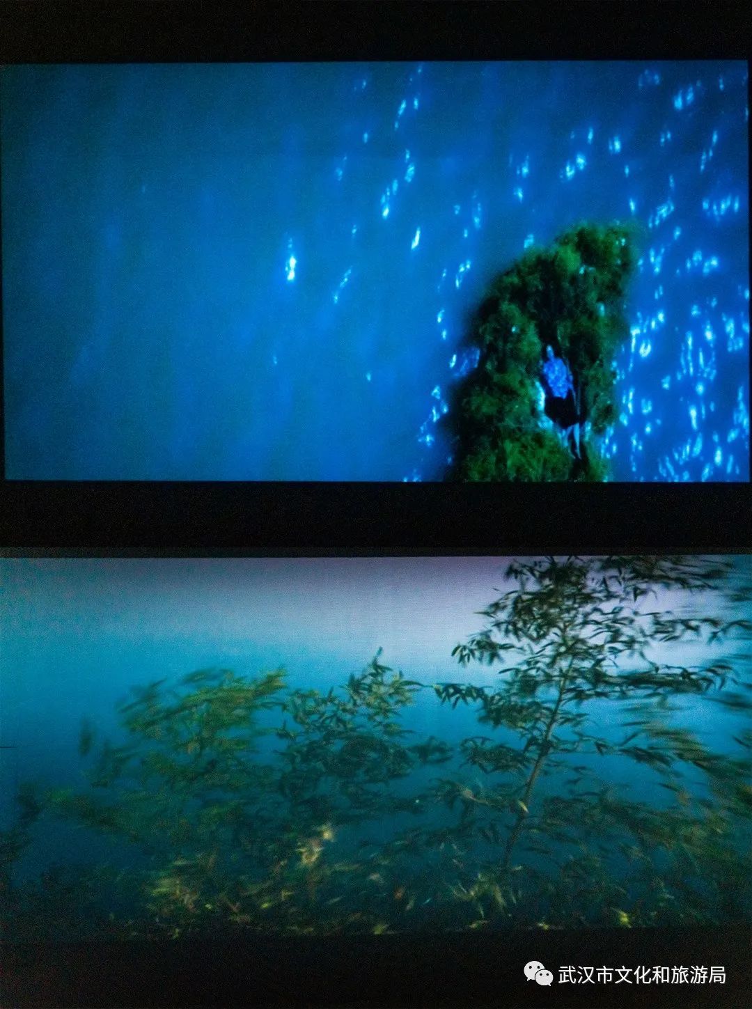 疾风骤雨中的竹林,有畅游水面的仙人……三面墙上,都有大幅的动态投影。