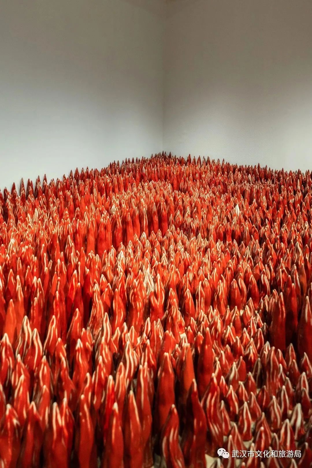 4000多件陶瓷烧制的红色火苗,高度大约与人的小腿齐平,遍布整个展厅,像一座座小火山。