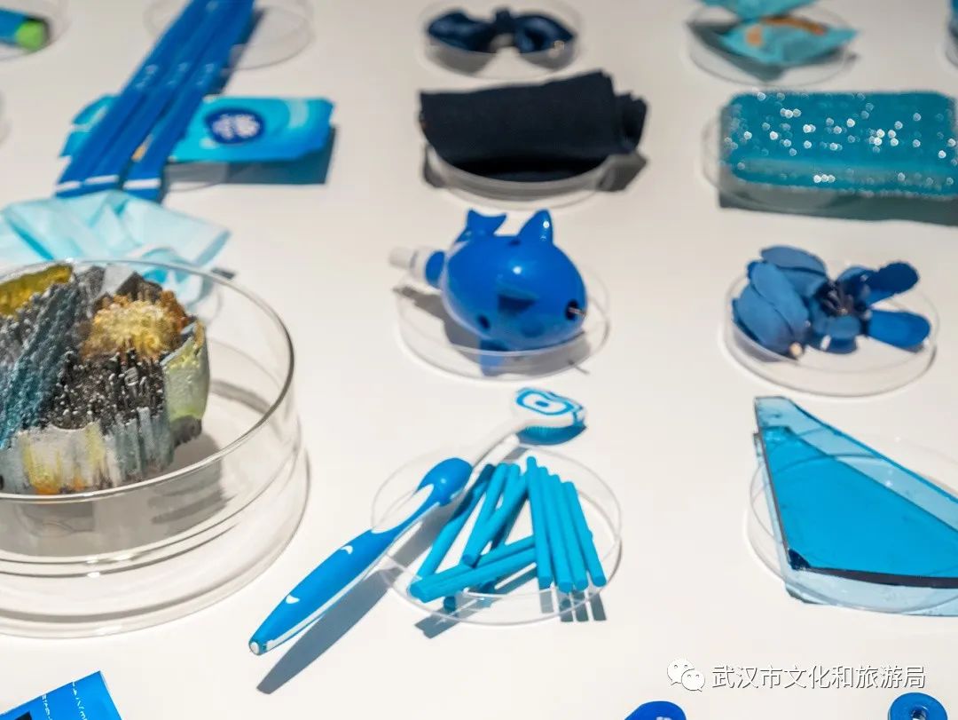 这是美国生物艺术家苏珊·安克带来的作品《粒子的来世》,每个玻璃窗内都有相同颜色的展品。