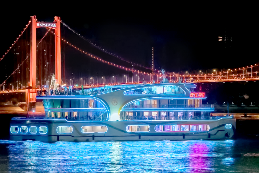 江岸汉口江滩23号码头,走进「长江荣耀」游轮,点亮国潮灯会,逛国风传统市集,看移动式演艺舞台,梦回千年前的水上市集。