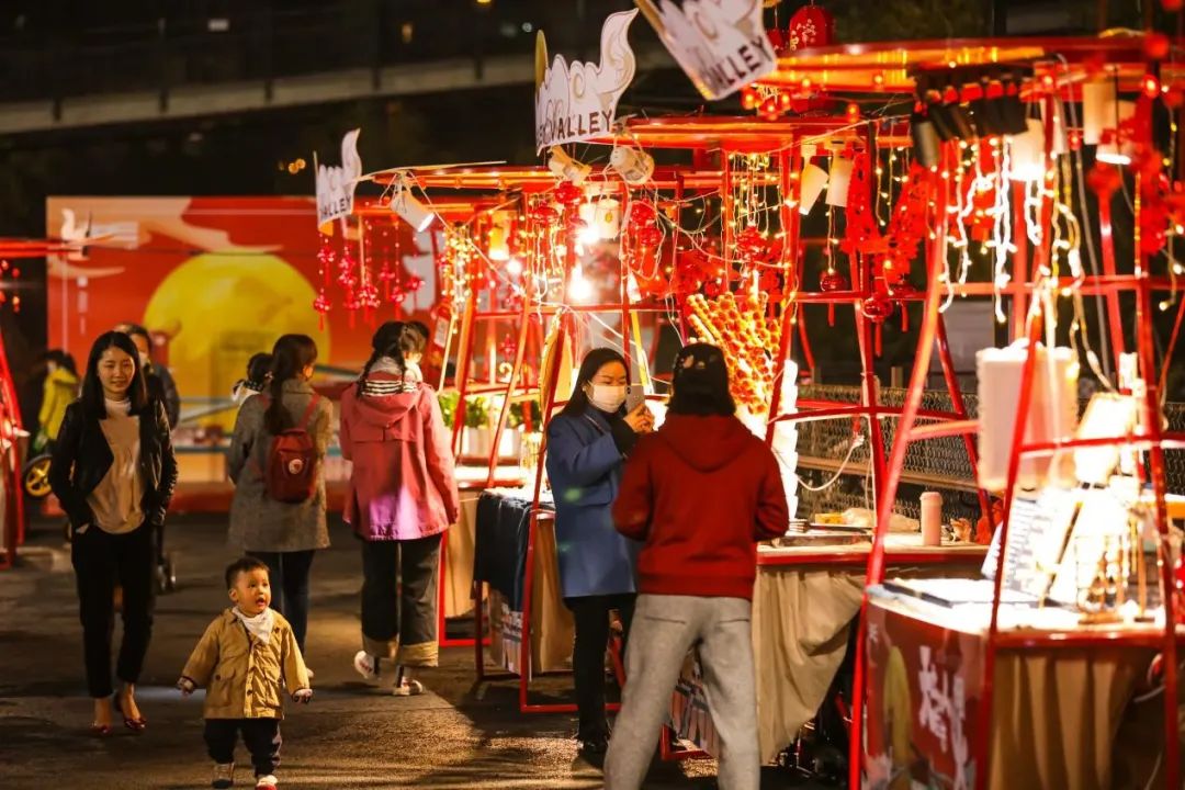 火红色中涌动新春期许,叫卖声中歌颂重聚喜悦。