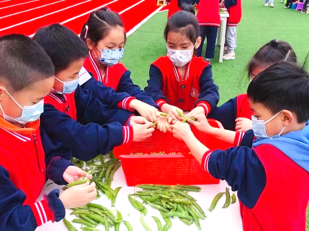 育才二小学解放分校的孩子们正兴趣盎然地对各种豆类的生长环境、营养价值和种植管理等提出自己的困惑和问题。学校从大处着眼,小处着手,开展了丰富多彩、形式多样的“粮食”劳动教育实践活动。