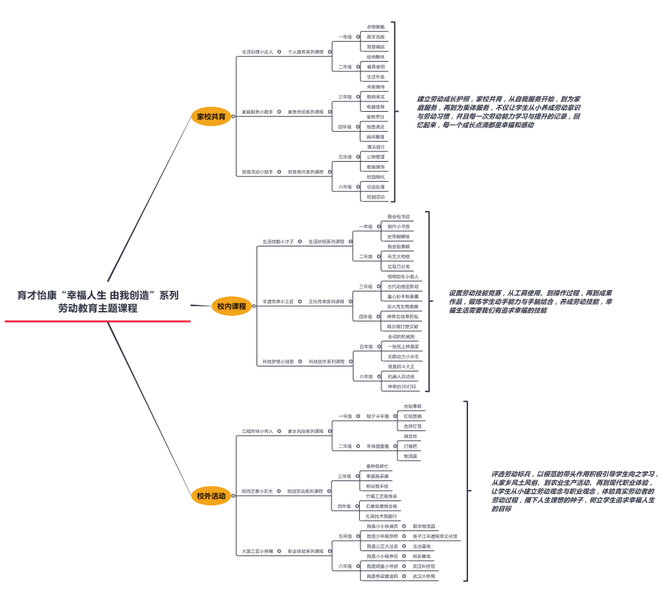 学校成立劳动教育领导小组,组建研究团队,结合学生认知特点与培养目标,以劳动教育主题课程为主线,从自我服务,到为家庭服务,再到为集体服务,打造校园、家庭、校外特色三级多元劳动课程内容。