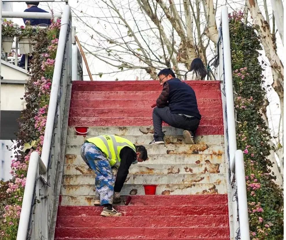 在解放大道永清街人行天桥,区城管局的市政工人师傅对桥梁楼梯进行打磨除锈、防腐处理。为了延长桥梁整体使用寿命,增加桥体美观性,每年都会对桥梁进行除锈处理,涂上新的防锈漆和桥面油漆。此次将对江岸区内解放大道上所有人行天桥进行除锈。