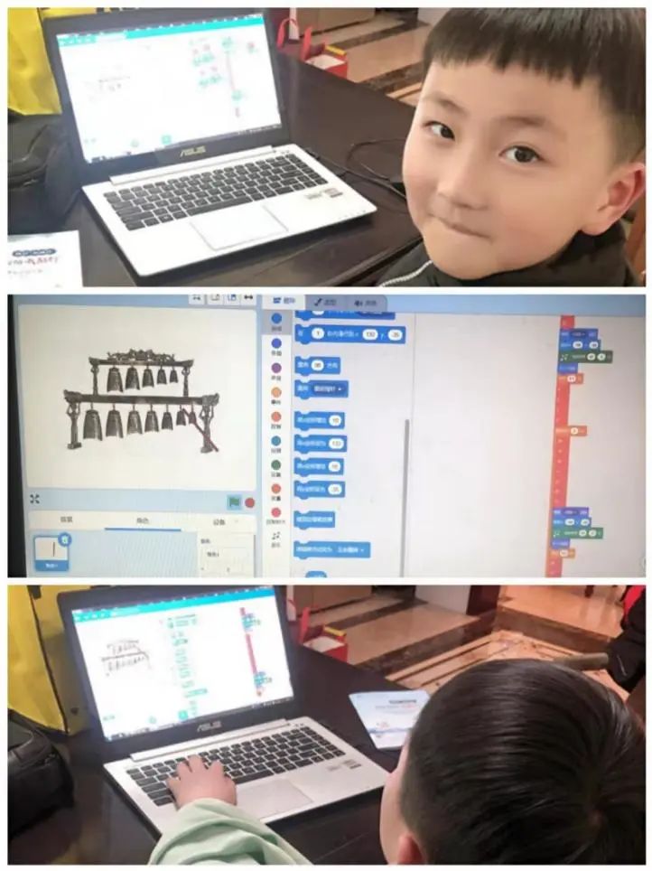 三(2)班的聂师城同学用电脑编程的方式做起音乐游戏。四(1)班方典恩和刘梓熙同学用妙手制作出了双语名片和实物编钟……学校的的“编钟课程”“科创课程”“生活课程”等特色课程都是依托于特定的学习场馆、学习场所、学习场景得以实施。