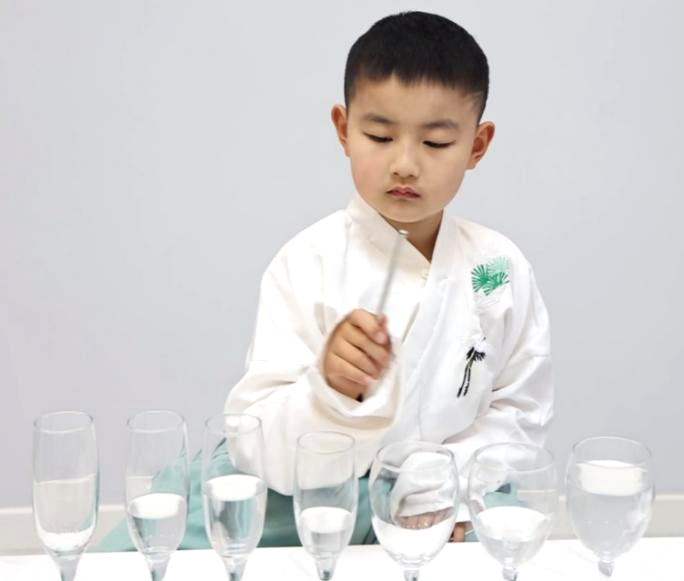 走出校外学习场,潘玲彤同学便尝试用不同大小的碗装水,发现当碗里放置不同量的水时,可以发出不同的声音。