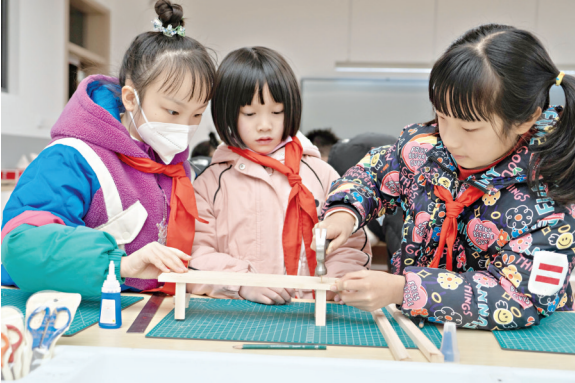 新学期,江岸区长春街第三小学将木作知识融合学科知识,开设以“武汉的桥”为主题的木工坊社团活动。活动课从江与桥的历史开始,指导孩子们用木材与废旧纸盒结合,打造武汉的城市版图。增强学生的创新意识和实践能力,体验中国传统木文化的魅力和动手创作的乐趣,传承工匠精神。