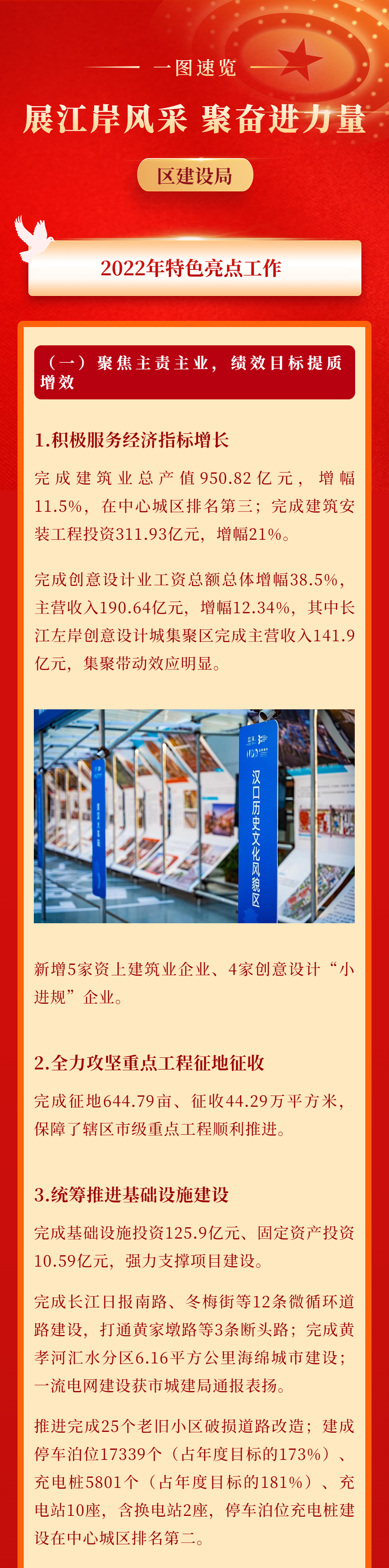 结合区情积极谋划基础设施项目,持续改善生活出行环境,全面推进江岸悦动园林文体停车综合建设项目建设。结合“共同缔造”理念,探索基础设施建设,特别是老旧小区破损道路改造新模式新方法,提档加速停车场充电桩建设,切实解决居民关心的出行难题。