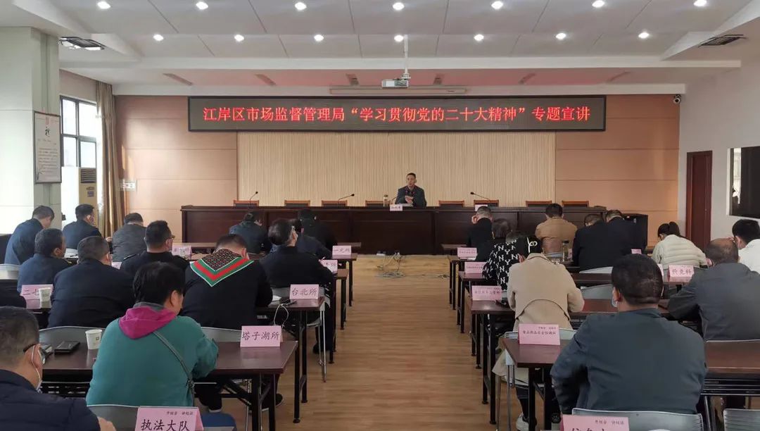 为充分发挥示范引领作用,区市场监管局班子成员以上率下,先行一步,示范宣讲,掀起全局学习宣传贯彻党的二十大精神高潮。党组书记带头开展“学习贯彻党的二十大精神”专题宣讲,作题为《学习党的二十大精神 交出江岸市场监管新时代答卷》报告。