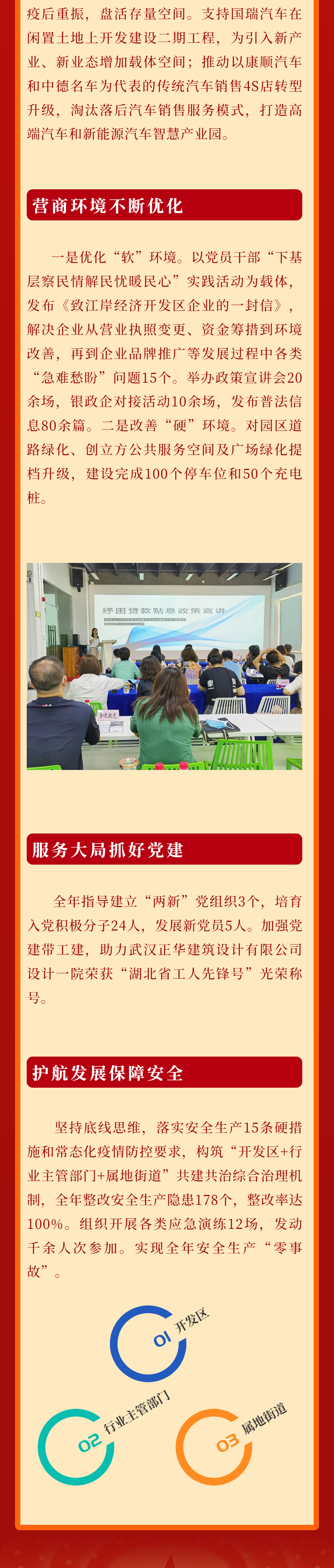 紧扣中心工作,把“两新”组织党建工作与培育“531”产业链、打造产业集群相结合。以“党建链”串起“产业链”,积极推动“两新”党建与产业发展同频共振,融合发展。以“党建+产业链”助力产业招商在“补链、强链、延链、造链”上有新突破,为江岸经济发展注入红色动能。