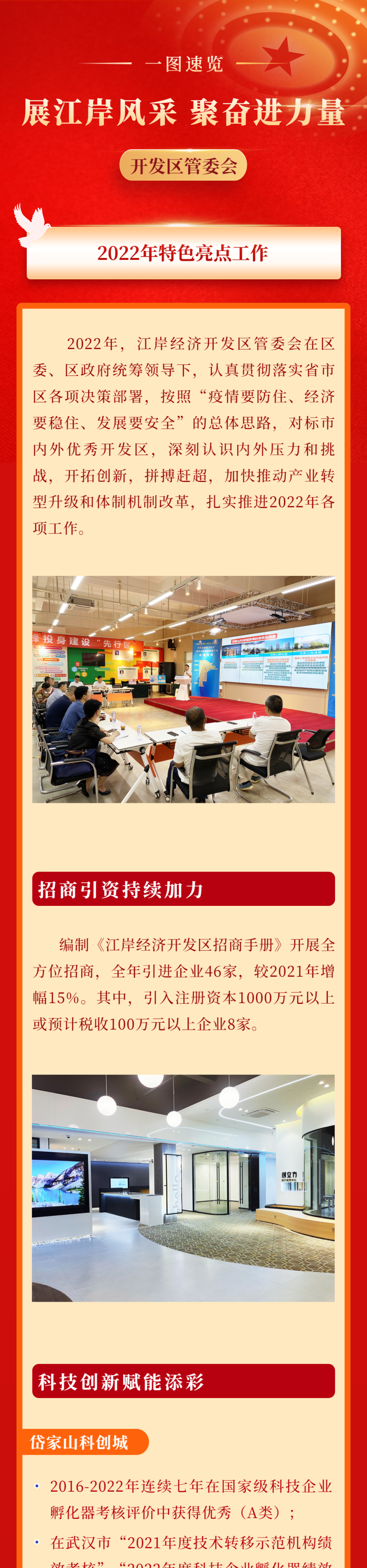 2023年是江岸经济开发区产业转型升级“启动年”,开发区管委会将以党的二十大和习近平总书记视察武汉重要讲话精神为指引,深入贯彻落实区第十三次党代会二次会议精神,进一步贯彻新发展理念,把握新发展机遇,展现新发展作为,从以下三个方面做好2023年重点工作。