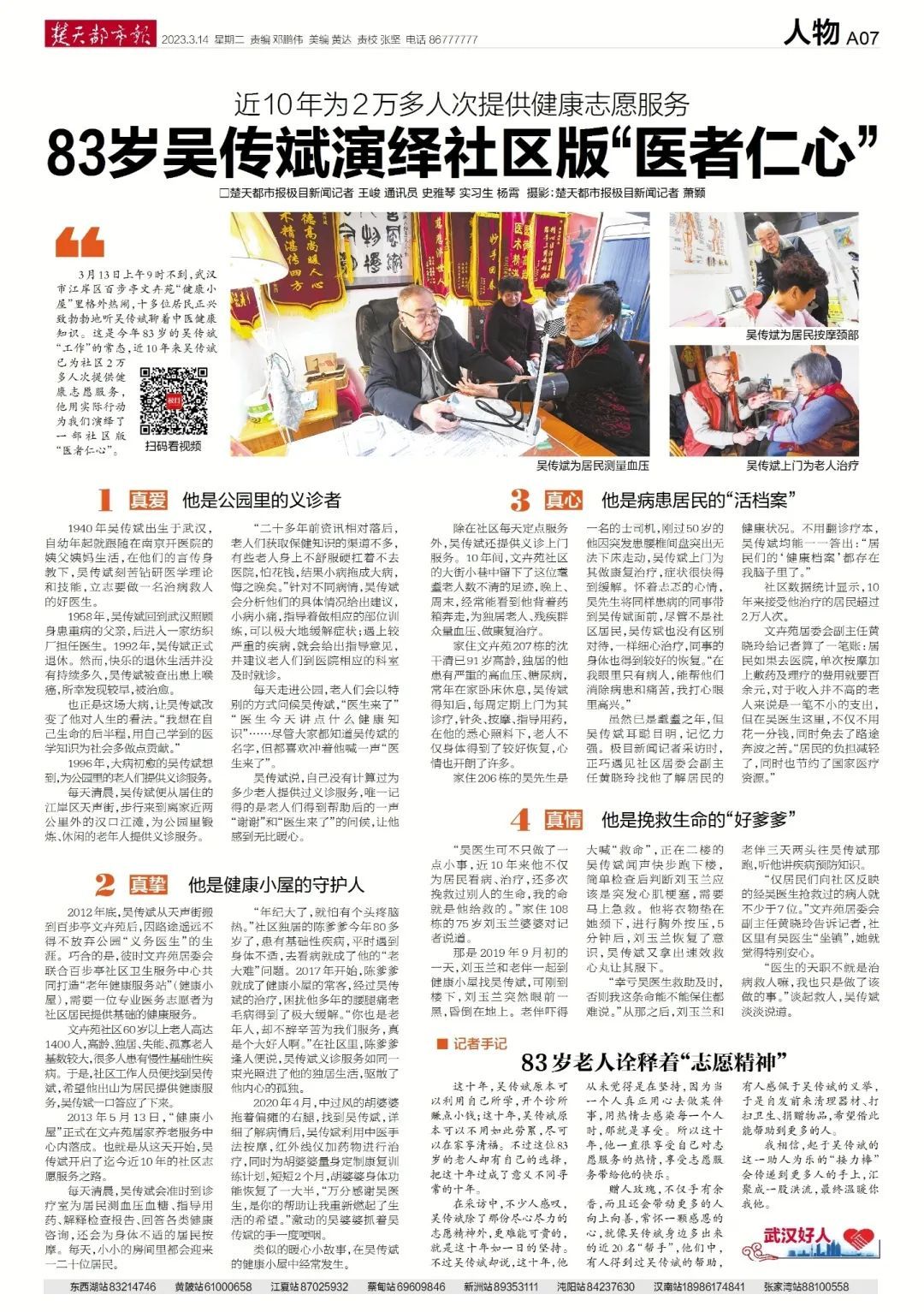 近日,《楚天都市报》专版报道江岸百步亭文卉苑“老年健康服务站”的专业医务志愿者吴传斌,10年来为社区2万余人次居民提供定点健康服务、上门义诊,诠释尽心尽力、无私奉献的“志愿精神”。全文如下: