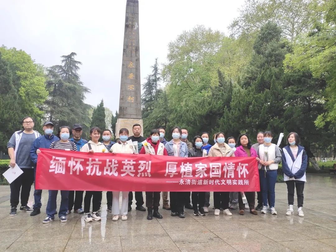 新时代文明实践所开展“缅怀抗战英烈 厚植家国情怀”清明节祭奠英烈活动,工作人员及居民代表前往位于解放公园内的苏联空军志愿队烈士墓,手持菊花瞻仰纪念碑和烈士陵墓,为烈士献上花篮与鲜花,向革命先烈们鞠躬默哀,寄托自己的哀思和敬意,厚植家国情怀。