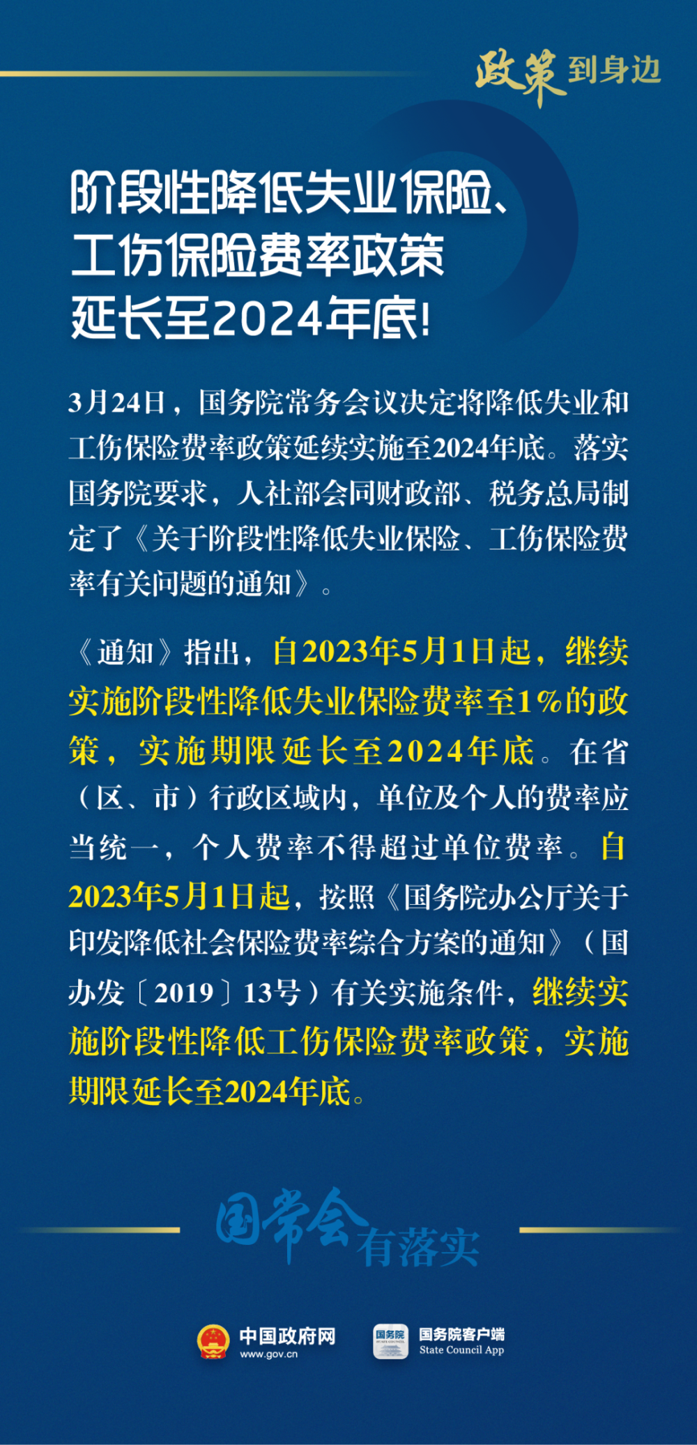 一、自2023年5月1日起,继续实施阶段性降低失业保险费率至1%的政策,实施期限延长至2024年底。在省(区、市)行政区域内,单位及个人的费率应当统一,个人费率不得超过单位费率。