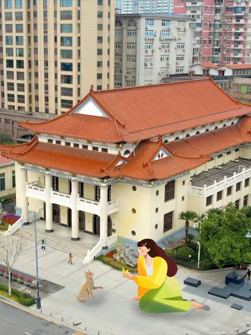 这座中西合璧的建筑,是武汉市政府礼堂,三层水泥框架结构,左右对称布局,中部凸起,两侧设有晒台,正立面入口处门廊向外凸出,四根高大圆柱并列而立,直抵二层,三扇半圆形大拱门位于柱后,整体建筑庄严典雅,精美而大气。