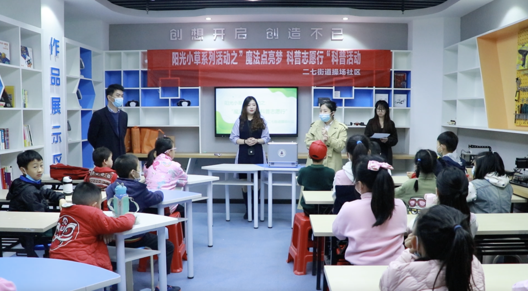 二七街道操场社区开展阳光小草系列活动之“魔法点亮梦 科普志愿行”科普活动启动仪式,魔术师现场为参与活动的小朋友以及家长们带来精彩的魔术表演。此次活动激发了小朋友们学习魔术背后的科学原理的强烈兴趣,帮助他们树立正确的世界观、人生观和价值观。