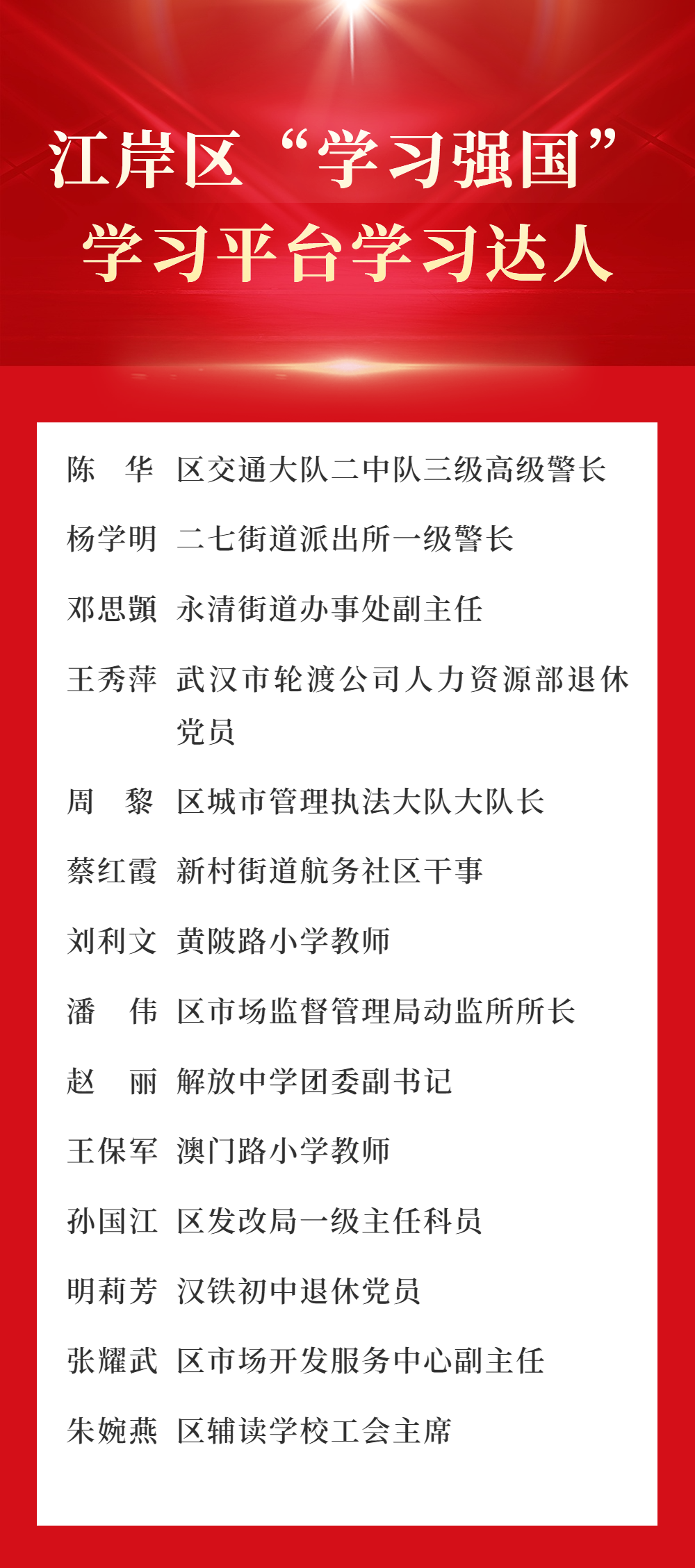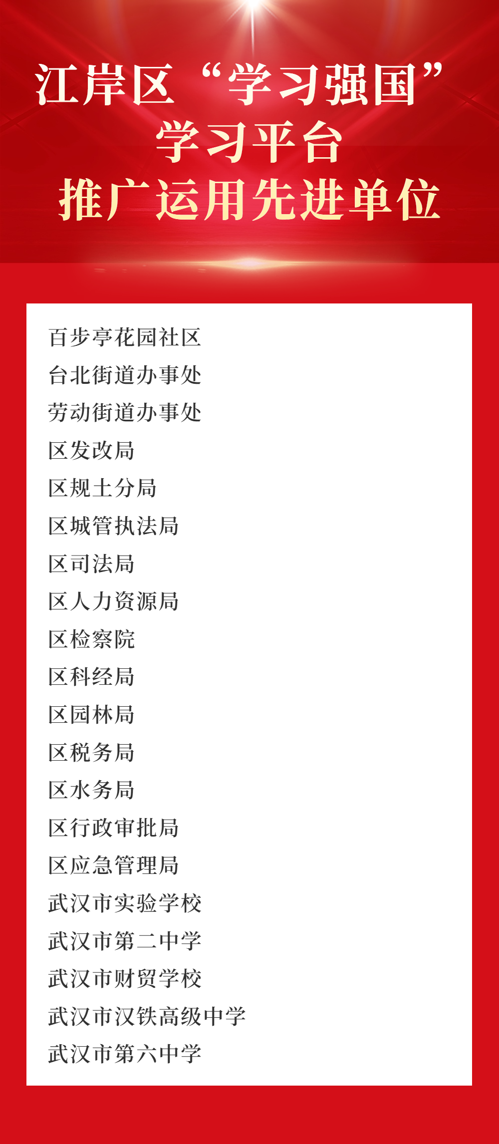 “学习强国”学习平台上线以来,江岸区各街道、各部门、各单位高度重视,精心组织,引导各级党组织和广大干部群众用好学习平台,加强新时代党的理论武装工作,涌现出一批发挥好平台功能、组织好理论学习的先进单位和一批勤于学习、善于学习的活跃用户。