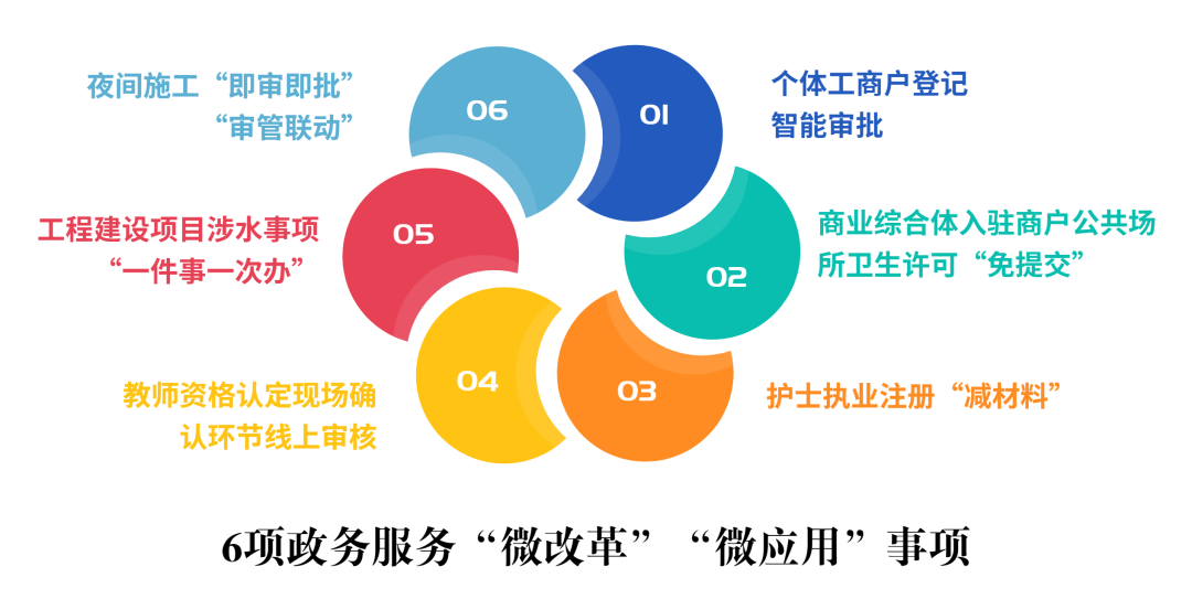 此次投入试点运行的“微改革”“微应用”事项,分别是个体工商户登记智能审批、商业综合体入驻商户公共场所卫生许可“免提交”、护士执业注册“减材料”、教师资格认定现场确认环节线上审核、工程建设项目涉水事项“一件事一次办”、夜间施工“即审即批”“审管联动”。