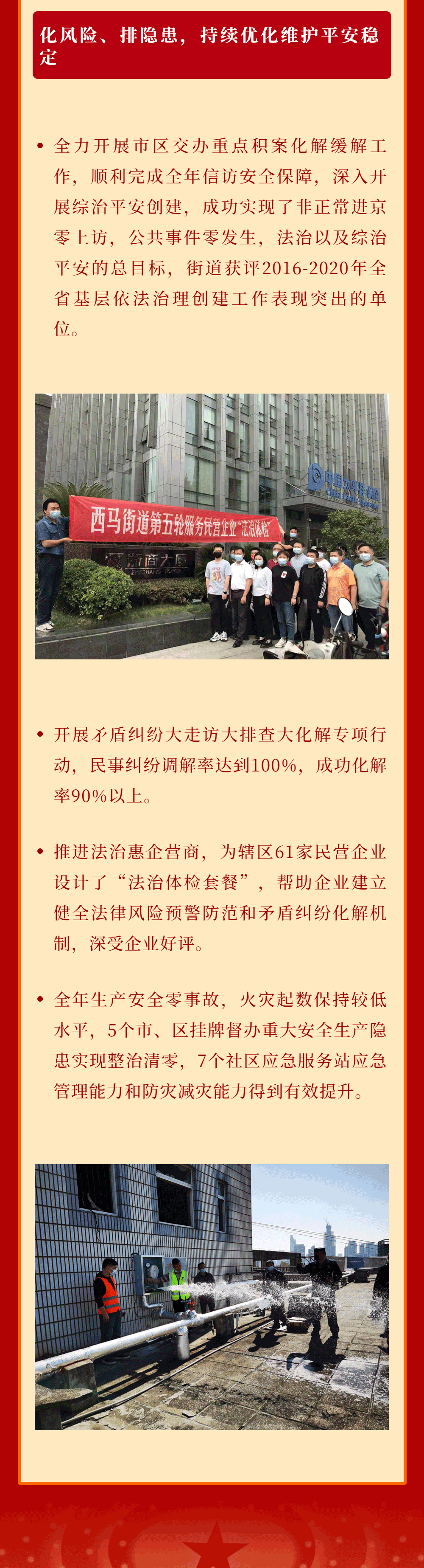 积极构建“区域统筹、开放融合、上下联动、条块协同、服务为本、信息支撑”的城市治理新格局。进一步规范综治中心建设,深化网格化管理和基层平安细胞创建,有效推进社会治理资源向家家户户延伸,推进基层治理能力建设。狠抓道路环境市容整治,提高日常市容环境管理标准,提升城市综合管理水平。加大普法力度,把握普法重点对象,进一步提升公民法治素养,全力推进省市法治示范街道创建;擦亮“徐广说法”法治服务品牌,启动西马“应急服务平安圈”品牌,争取智慧小区、法治惠民、消防设施全覆盖,强推街道大平安建设再上新台阶。