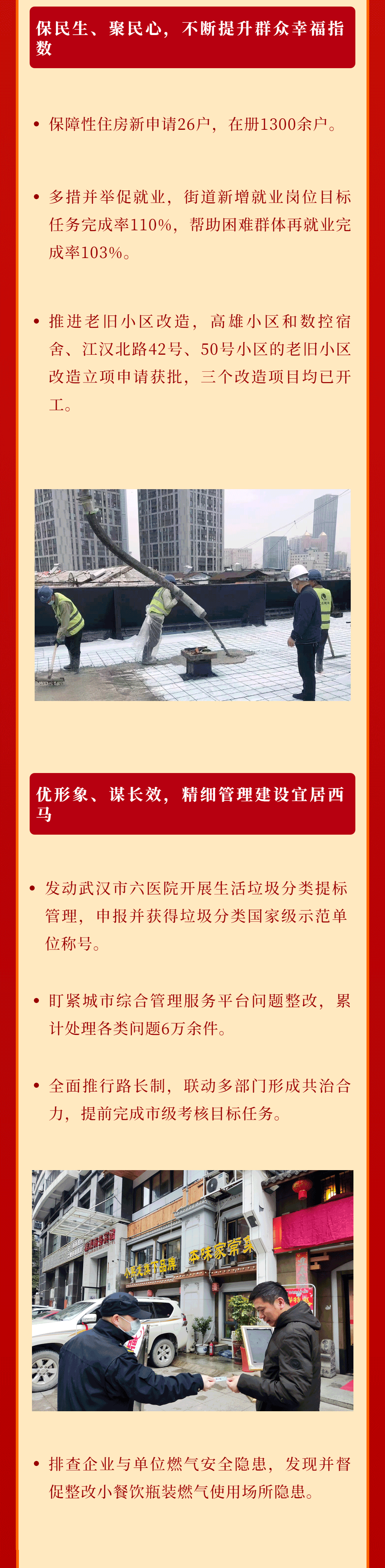 扎实推进老旧小区改造,抓好二次供水、屋面外墙渗漏等工程质量,着力增强居民获得感幸福感。持续落实民生保障和精准帮扶项目,进一步优化完善公共服务,加快“一张网”及“四办”建设,持续做好“高效办成一件事”改革,让居民办事更高效更便捷。推进社区综合服务设施建设,积极开展就业、养老、医疗、托幼等服务,加强对困难群体和特殊人群关爱照护,做好疫苗接种等保障性工作,切实维护好居民群众生命健康安全,提升居民幸福指数。引入社区专业服务,采取项目示范等方式,实施政府购买社区服务,开展“新时代新社区新生活”服务质量提升活动,推进社区服务标准化。
