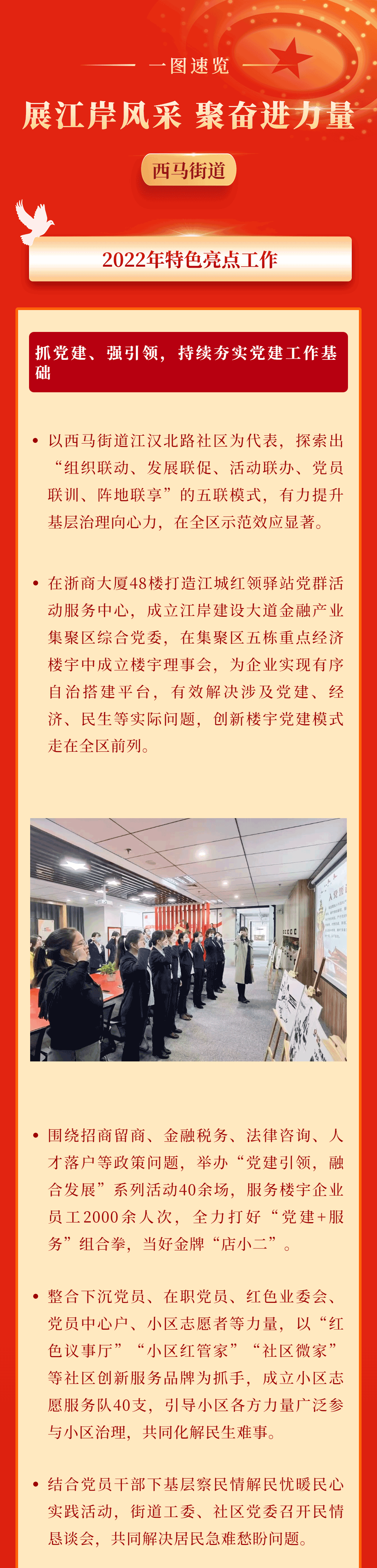 广泛开展“学习党的二十大 奋进新征程”系列主题宣讲活动,将广大干部群众的思想和行动统一到党的二十大精神上来,确保党的二十大精神入脑入心、见行见效,凝聚守正创新、团结奋斗的强大合力。持续推进江岸建设大道金融产业集聚区、江汉北路社区党建示范点工作,积极做好百步亭式示范社区创建工作,围绕“一下三民”和“共同缔造”等主题,扎实为辖区企业、社区居民领办一批帮扶解困实事,争取基层党建再创新高度。