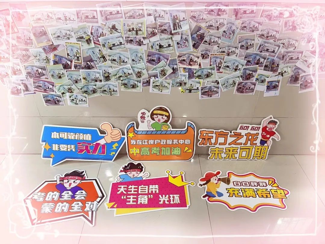 为了给考生提供轻松、愉悦的办证环境,缓解考生考前的紧张情绪,江岸户政服务中心将二楼窗口装饰为“考试季”主题台位——“状元台”和“樱花里”。