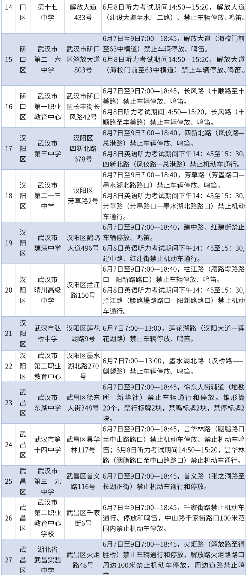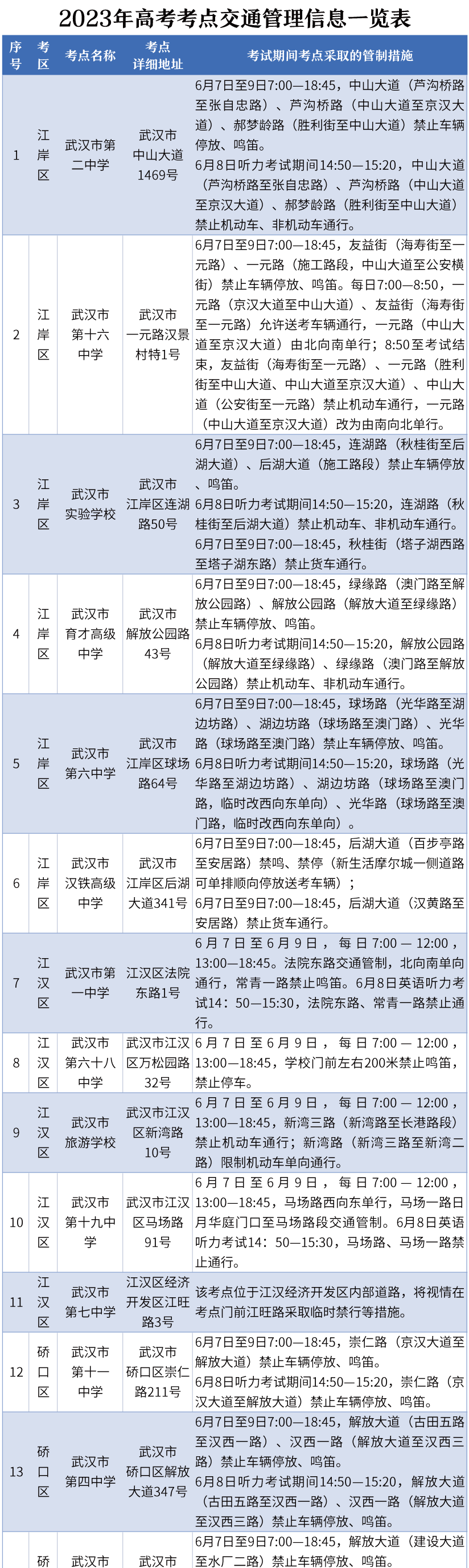 江岸区有武汉市第二中学、武汉市第十六中学、武汉市实验学校、武汉市育才高级中学、武汉市第六中学、武汉市汉铁高级中学等六个考点。考试期间,考点周围的路段将实施交通管制。