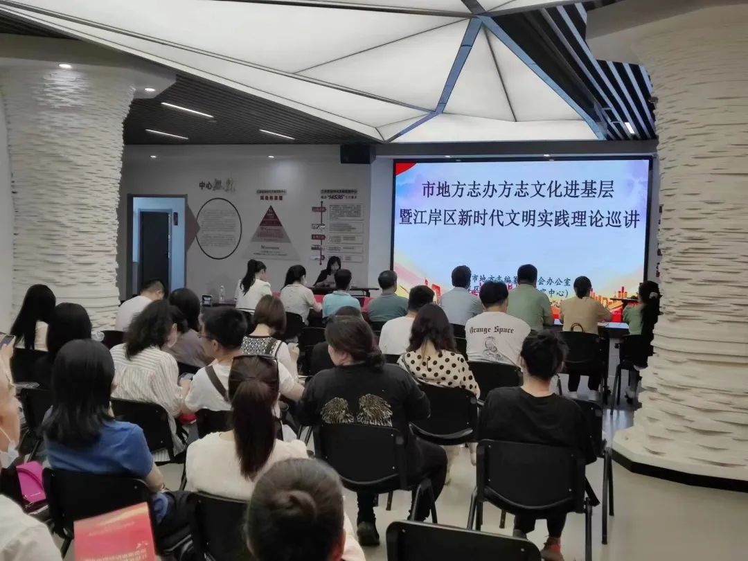 区委宣传部、区档案馆(史志研究中心)共同策划,联合武汉市地方志编纂委员会办公室开展方志文化进基层暨江岸区新时代文明实践理论巡讲活动。活动现场,武汉地方志专家王汗吾围绕“汉口最年轻的主城区——江岸区”作专题辅导报告,与辖区干部群众互动交流了当地历史文化知识。现场同时开展赠书活动,向部分社区居民赠送《武汉春秋》《建设现代化大武汉》等书籍,获得社区居民的一致好评。