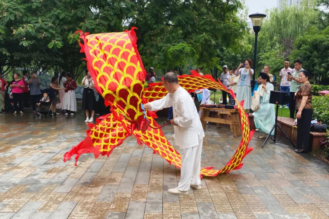 台北街道宝岛社区新时代文明实践站联合稷周养老服务公司、泽霈社工站、卓邦红色物业在宝岛公园内举办“我们的节日”“汉风雅乐暖端午 粽香传承宝岛情”等主题活动。在“汉礼巡游 击鼓舞龙舟”表演中,一条条威风凛凛的“祥龙”在激扬的鼓声中上下翻腾,不停地在空中飞舞,活灵活现、栩栩如生。