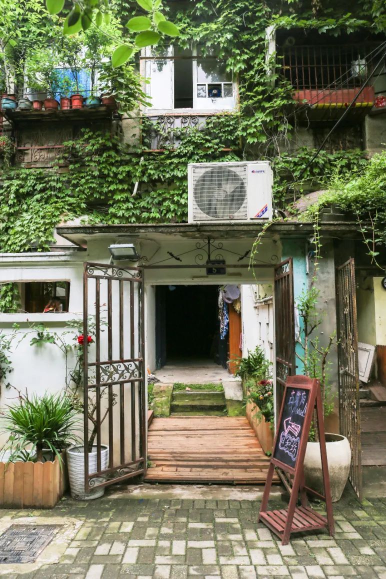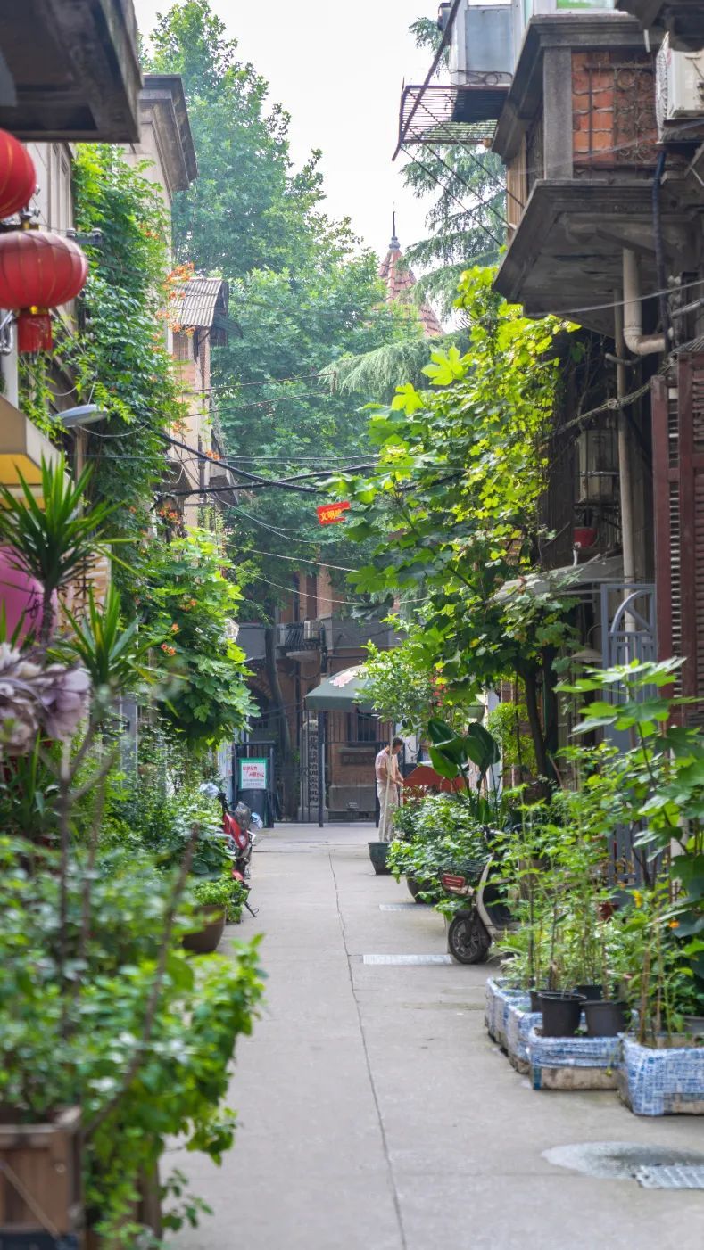 巷内两侧绿意盎然,郁郁葱葱的爬山虎围绕着圆拱形的窗户,这里的每栋房屋都有个小院,里份内布满了绿植花卉。