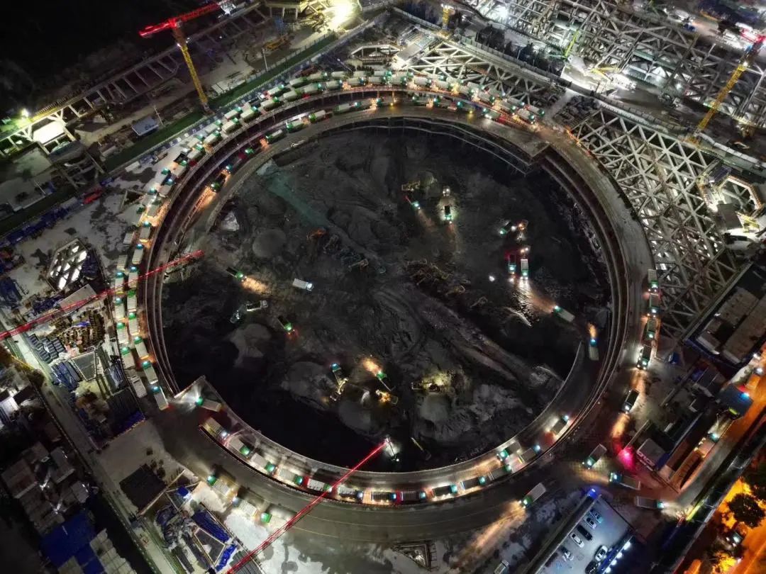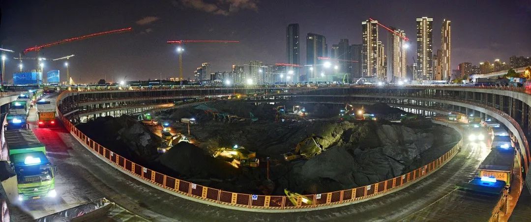夜幕下俯瞰,这个“超级基坑”宛若一个巨大的圆盘,开启大灯的渣土车首尾相连,将基坑串成一条晶莹的“宝石项链”。
