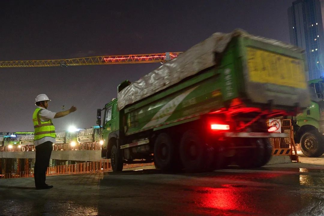 6月27日晚8时,在施工现场,一辆接一辆的渣土车正顺着环形坡道鱼贯驶入基坑。