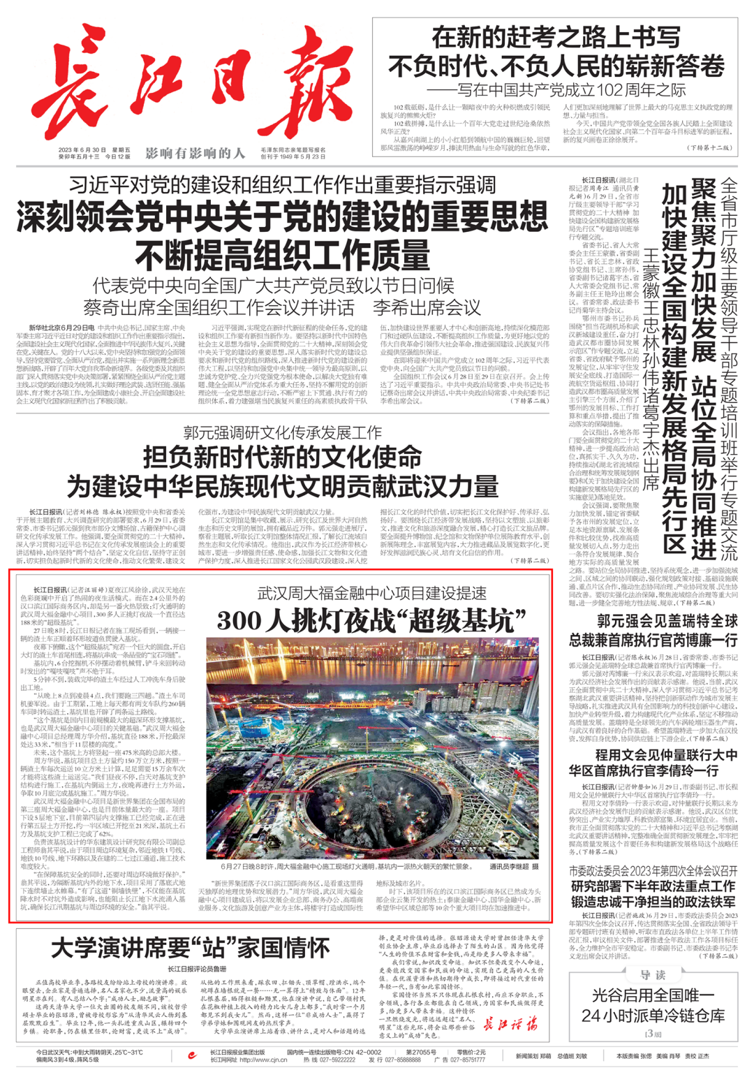 6月30日,《长江日报》头版报道汉口滨江国际商务区,300多人挑灯夜战直径达188米的“超级基坑”,武汉周大福金融中心项目加速推进。