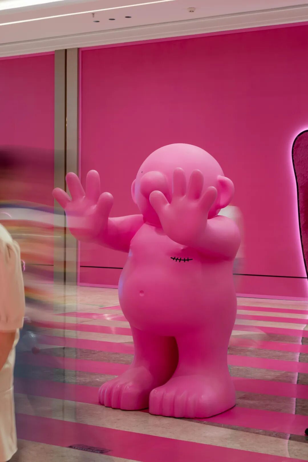 店内的配色很有Y2K千禧风,红绿撞色是亮点。包包和娃娃、还有迪斯科灯球,真就cool!