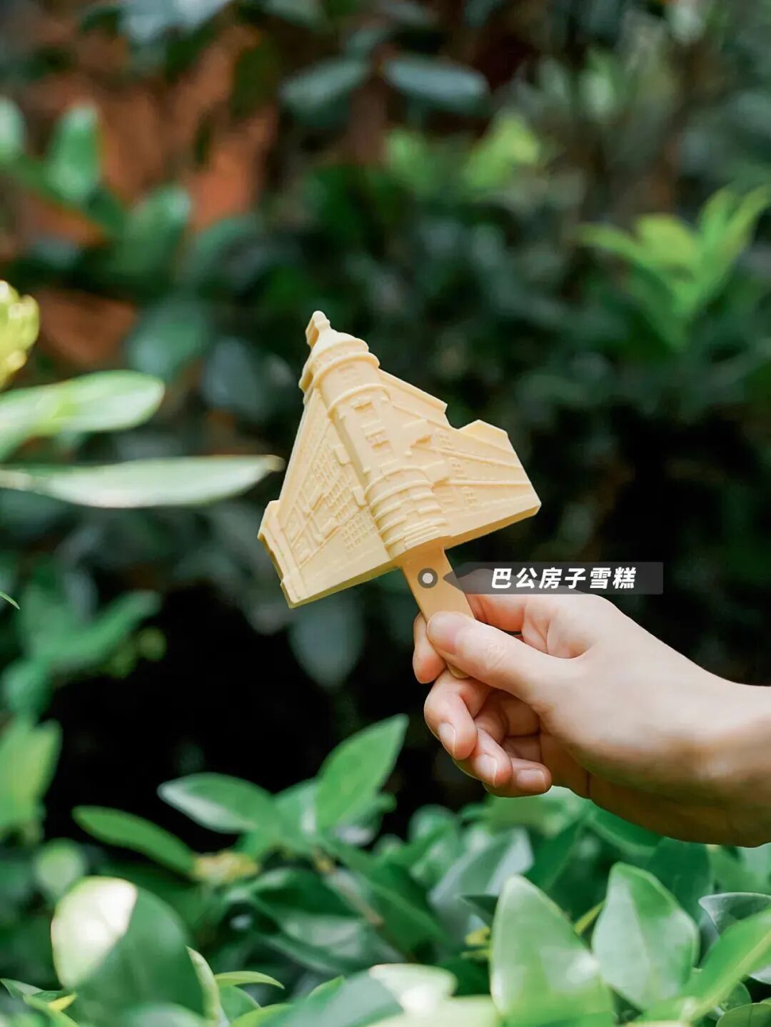 轻牛乳味的雪糕口感绵密,奶呼呼的味道传递着丝丝清甜,拿在手上迷你又可爱,叫人忍不住想举起雪糕和巴公房子来张纪念合影。