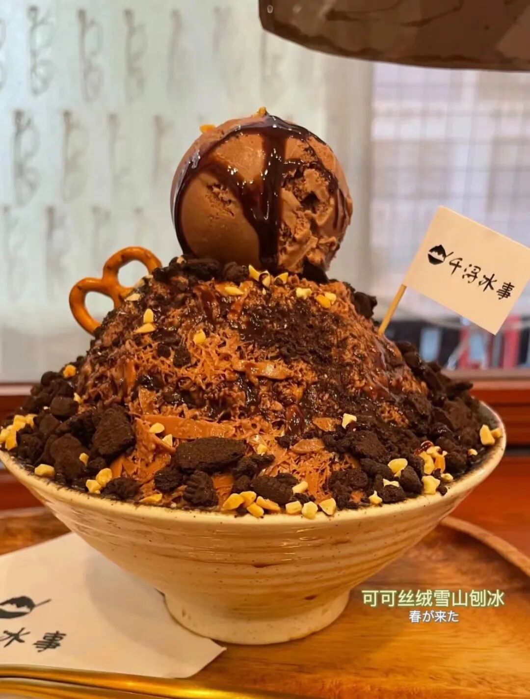 强烈推荐的还有「热情巧克力雪山刨冰」,可可味刨冰上面是奶油冰淇淋小球,再撒上奥利奥碎和花生碎,淋上点睛之笔巧克力酱,满满一碗料,简直是巧克力脑袋的梦中情冰!