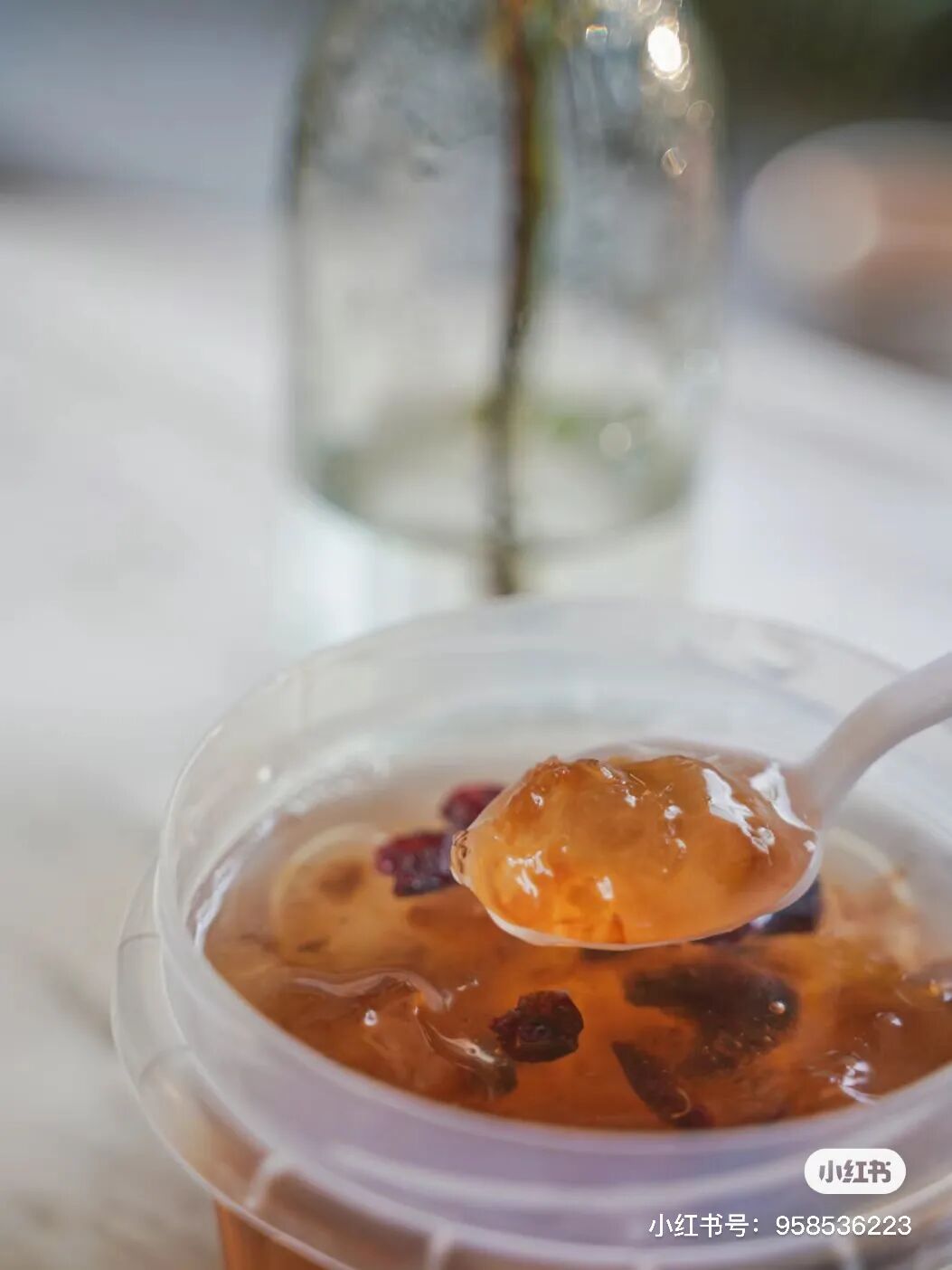 甜而不腻的糖水搭配上软软的桃胶,上面撒着十余粒蔓越莓果干和桂花碎,滋补养颜又清爽解暑,一口下去味蕾得到了极大的满足。