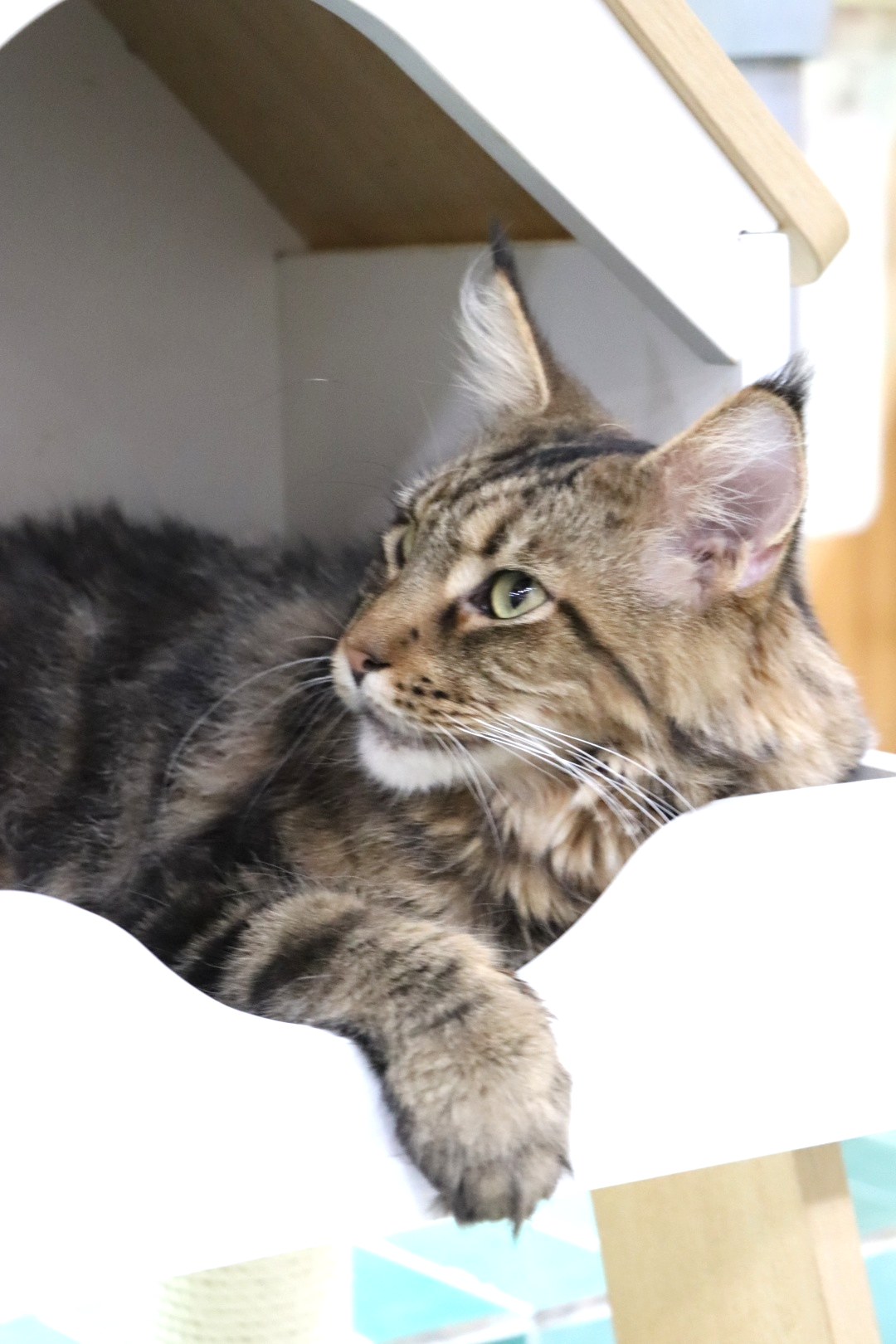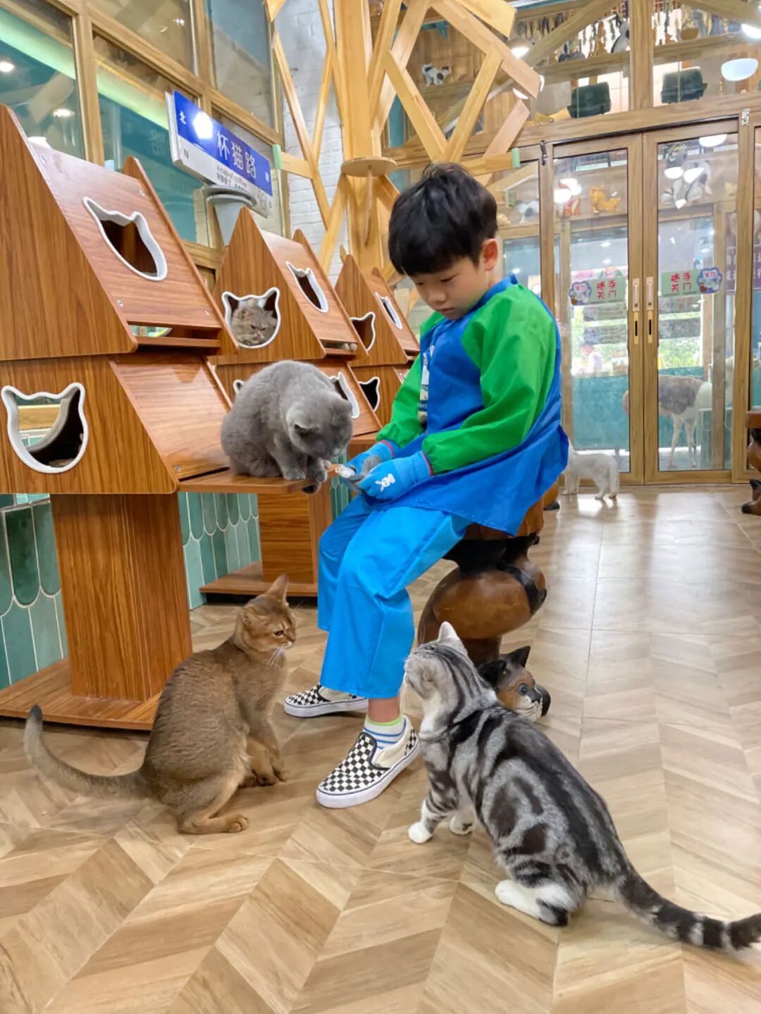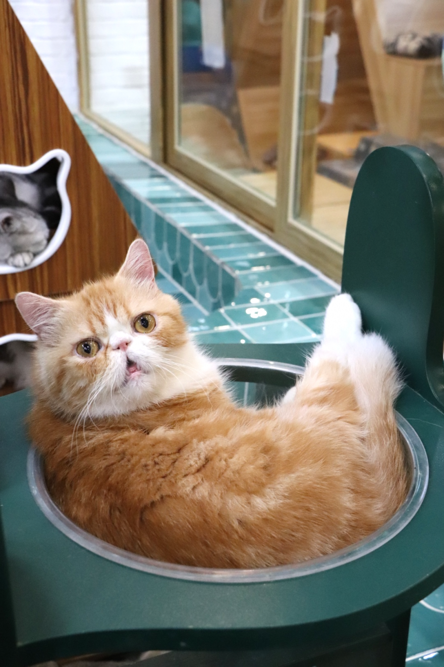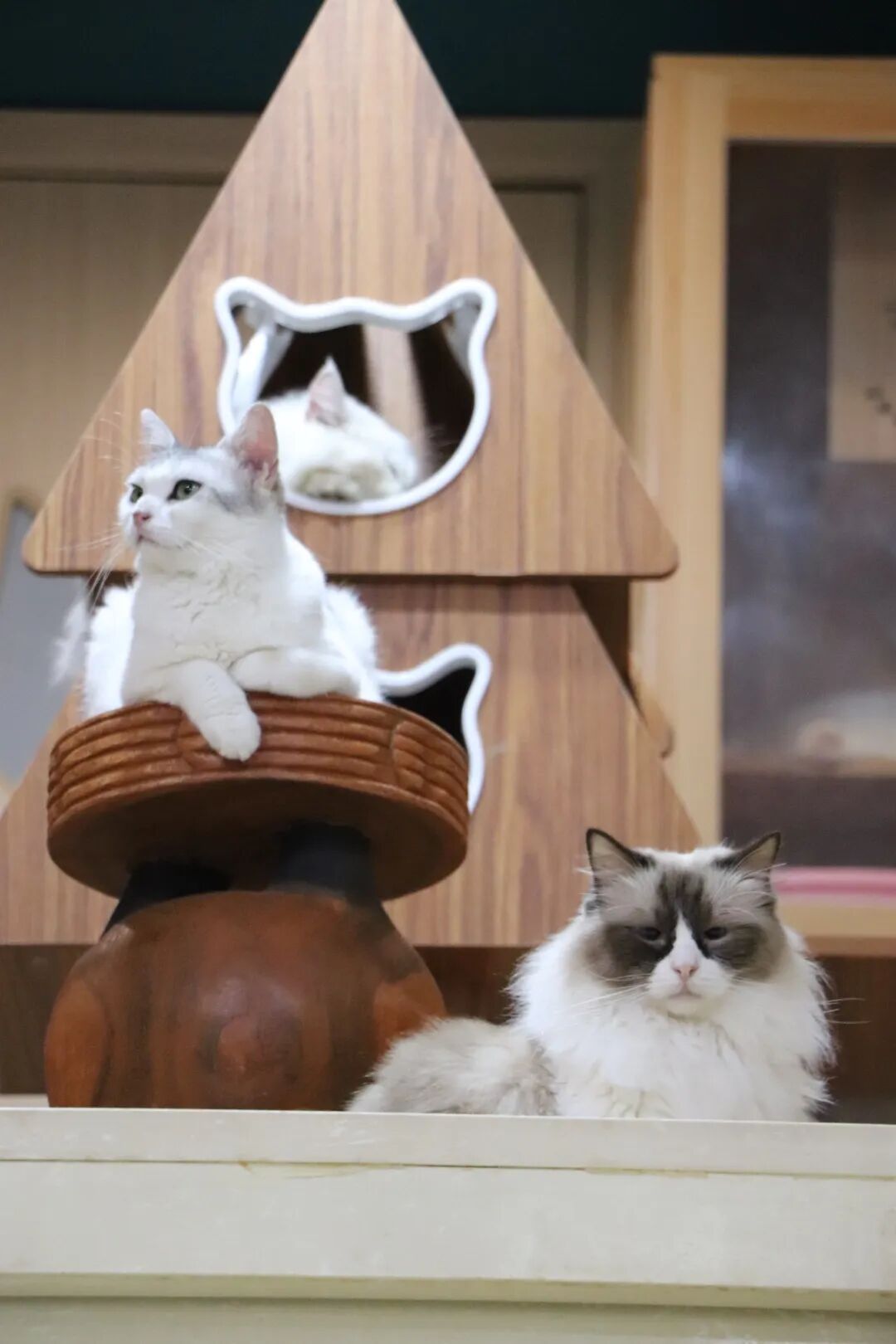 店内的每一只猫猫都自带角色属性。缅因猫“于晏”像是温柔又高贵的绅士,高大威猛的外表下隐藏着柔软的心,不时友好地帮旁边的小猫舔毛。