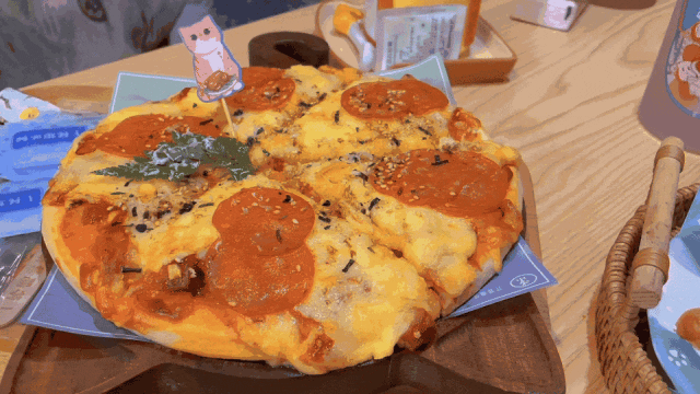 现做的「喵喵萨拉米手工披萨」用料很足,铺上厚厚的鸡肉和芝士,搭配意大利萨拉米。芝士拉丝的快乐,有谁能拒绝呢?