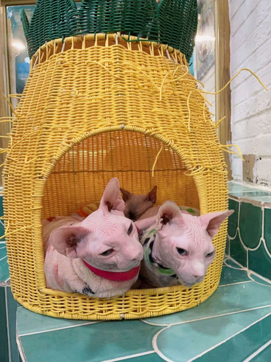 呆萌可爱的无毛猫“大嘴”和“whiskey”将“手手”踹在身下假寐,任你随意rua。