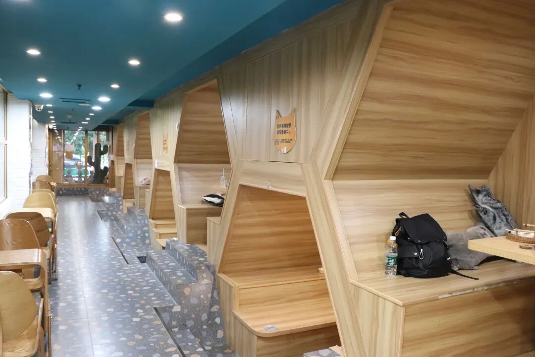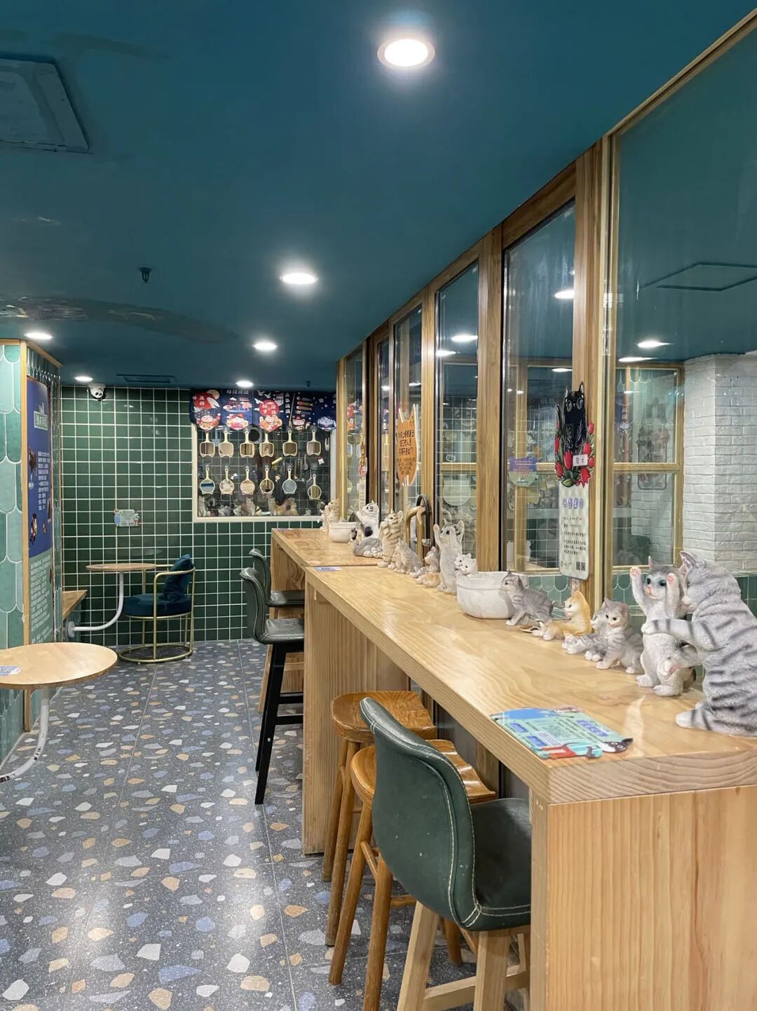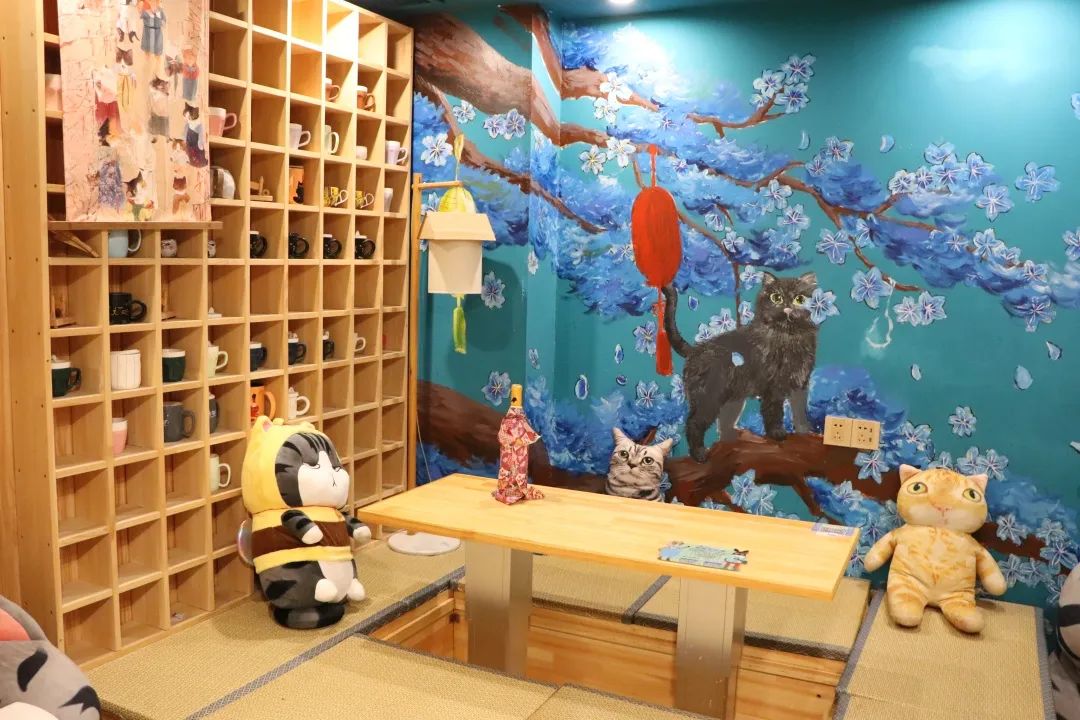 二楼还有私密性、视野更好的封闭隔间,各种猫猫元素的墙绘、抱枕、陶瓷摆件营造出十足的氛围感,让你沉浸式放松于“猫咪宫殿”。