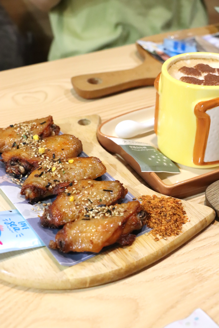 「喵喵秘制鸡翅」烤得恰到好处,上面点缀着木鱼花和芝麻,金黄的色泽分外诱人!
