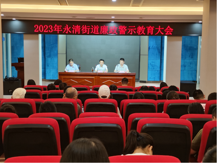永清街道召开全街党员干部警示教育大会。街道班子成员及机关干部、基层站所、社服中心工作人员,社区“两委”成员及社区党员共计80余人参会。街道工委书记讲授了题为“坚定不移全面从严治党 涵养风清气正政治生态”的廉政党课。会议指出全面从严治党是党永葆生机活力、走好新的赶考之路的必由之路;要始终坚持问题导向,保持战略定力,把党的伟大自我革命进行到底。